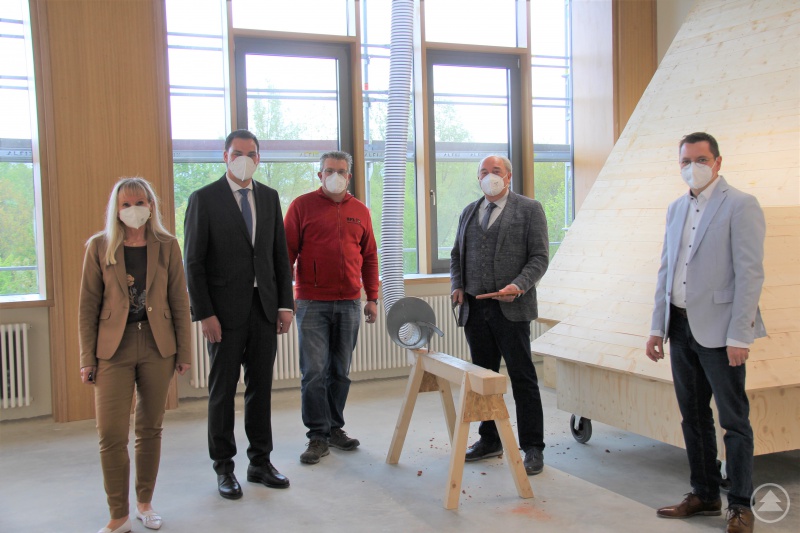 Eine besondere Herausforderung bei der Planung und Ausführung der Gebäudetechnik war die Lüftungsanlage in den Werkhallen. Gut 1,47 Millionen Euro hat allein diese Anlage gekostet. Beim Rundgang konnten sich (von links) Schulleiterin Elvira Wudy-Engleder, Landrat Sebastian Gruber, Jürgen Lehner und Landesinnungsmeister A. Ewald Kreuzer von der Dachdecker-Innung sowie Bürgermeister Heinz Pollak von der Leistungsfähigkeit der Anlage überzeugen.