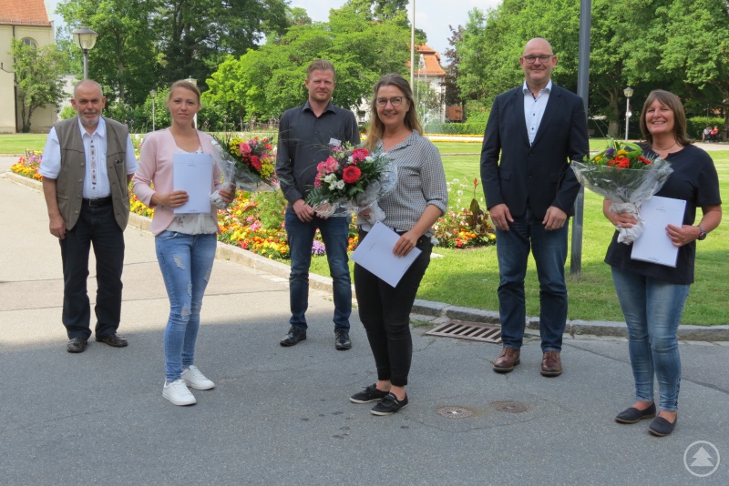 Dreimal die Bestnote Eins! (hinten, von links): Gerhard Kellner, Pflegedirektor, Josef Bauer und Hans-Peter Hartl, Stellv. Pflegedirektor gratulieren (v. links) Stephanie Bliesath, Denise Geith und Petra Scheingraber zum erfolgreichen Abschluss.