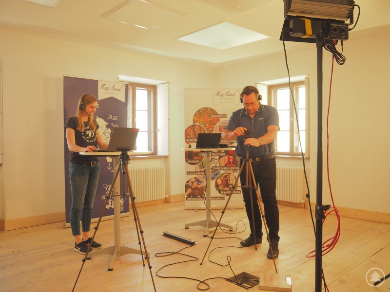 Aus der Bauhütte Perlesreut wird live übertragen. Geschäftsführerin Corina Molz und Projektkoordinator Volker Ernst bauen die Technik für die Videokonferenzen auf. Für die Teilnahme genügt jedoch ein Notebook oder ein Smartphone.
