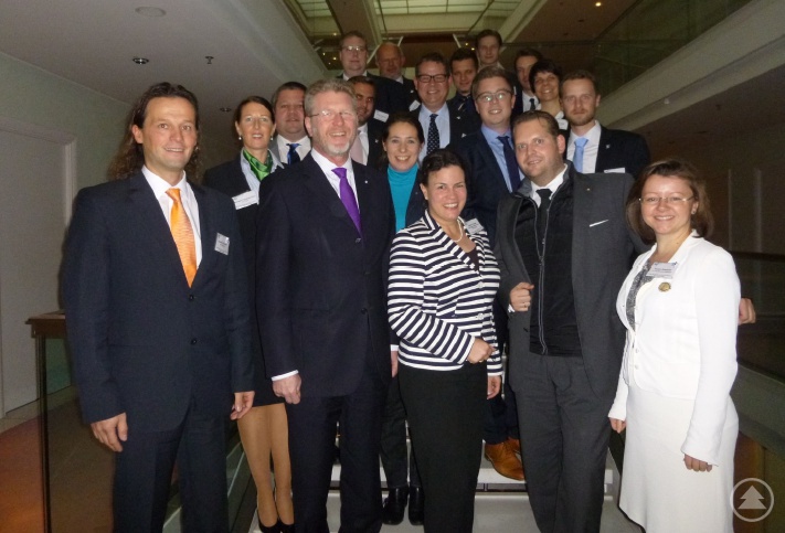 Die beiden neu ernannten Senatoren Martina Hauler und Rupert Bittl mit der Kreissprecherin Manuela Weber (links) und Mitgliedern der Wirtschaftsjunioren München e.V. (Bild: Manuela Weber)
