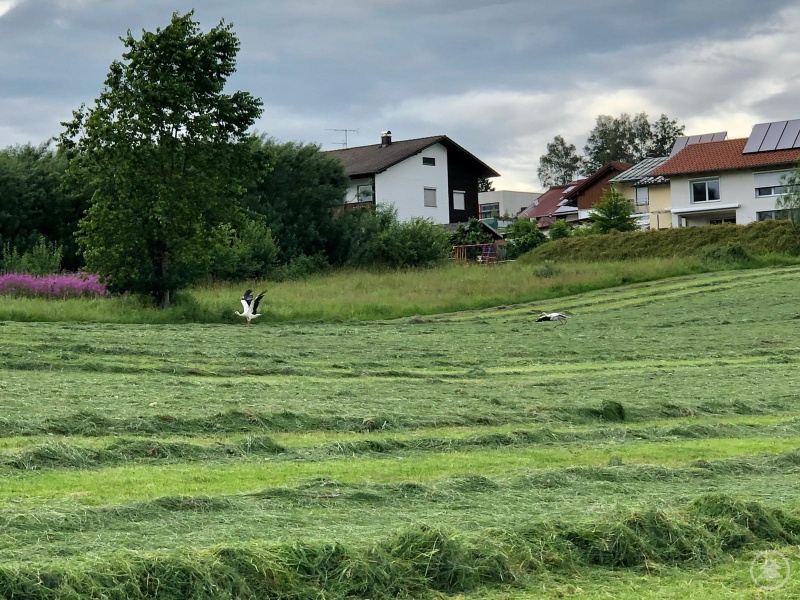Der Bauer wollte gerade das frisch gemähte Gras einholen, was die Störche allerdings nicht aus der Ruhe brachte.
