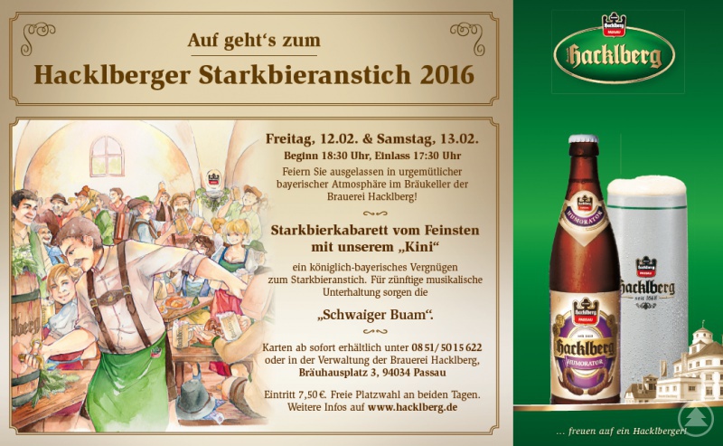 Die Braumeister brauen jetzt gerade den Doppelbock mit seinem vorgeschriebenen Stammwürzegehalt von mindestens 18 Prozent rund 7,5 Volumenprozent Alkohol. Die dunkle Farbe des Starkbieres - untergärig eingebraut, als Doppelbock zweifach - entsteht, weil Gerstenmalz mit dunklem Röstmalz durchmischt wird. Dies bedingt auch den urtypisch, leicht süßen Geschmack. Kurz gesagt: ein passendes Bier für lustige Abende beim Starkbieranstich der Brauerei Hacklberg im Hacklberger Bräukeller. Freitag, 12., und Samstag, 13. Februar, Beginn jeweils 18.30 Uhr, Einlass ab. 17.30 Uhr. Durch den Abend führt Martin Gruber vom Bayerischen Rundfunk.