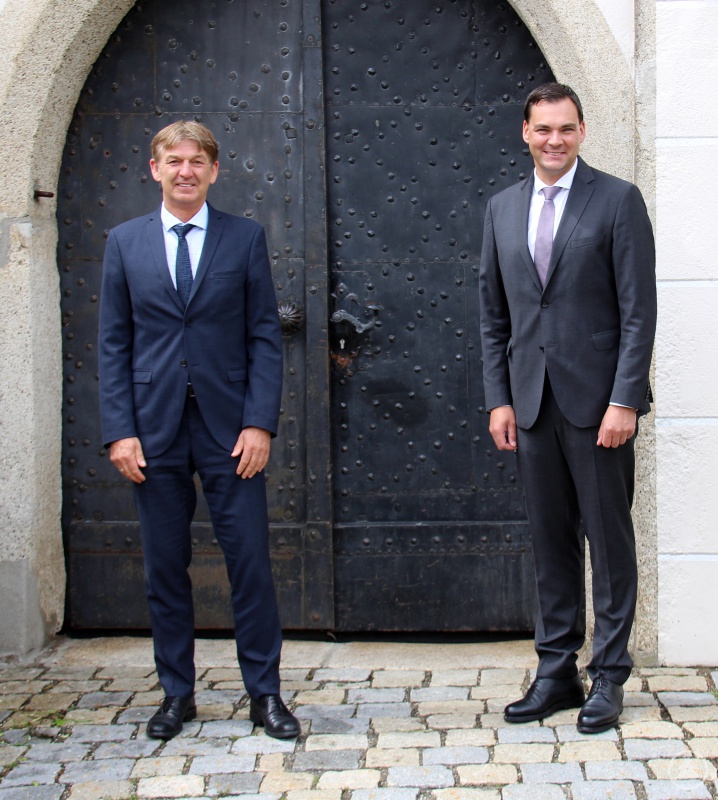 Zu einem kurzen Austausch trafen sich Landrat Sebastian Gruber und der Ministerialbeauftragter für die Realschulen in Niederbayern Manfred Brodschelm.