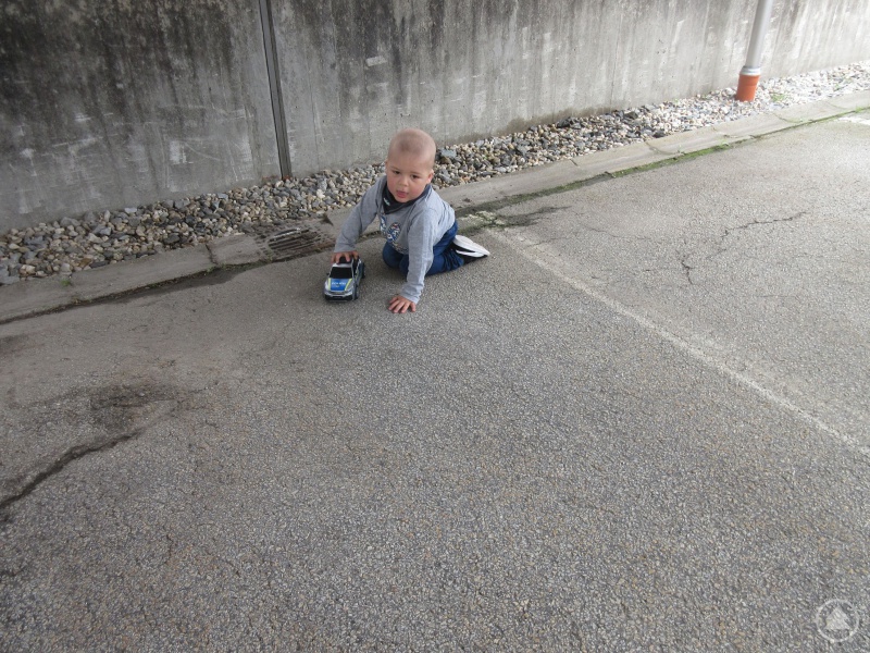 Elyas mit seinem neuen Polizeifahrzeug mit Blaulicht und Martinshorn