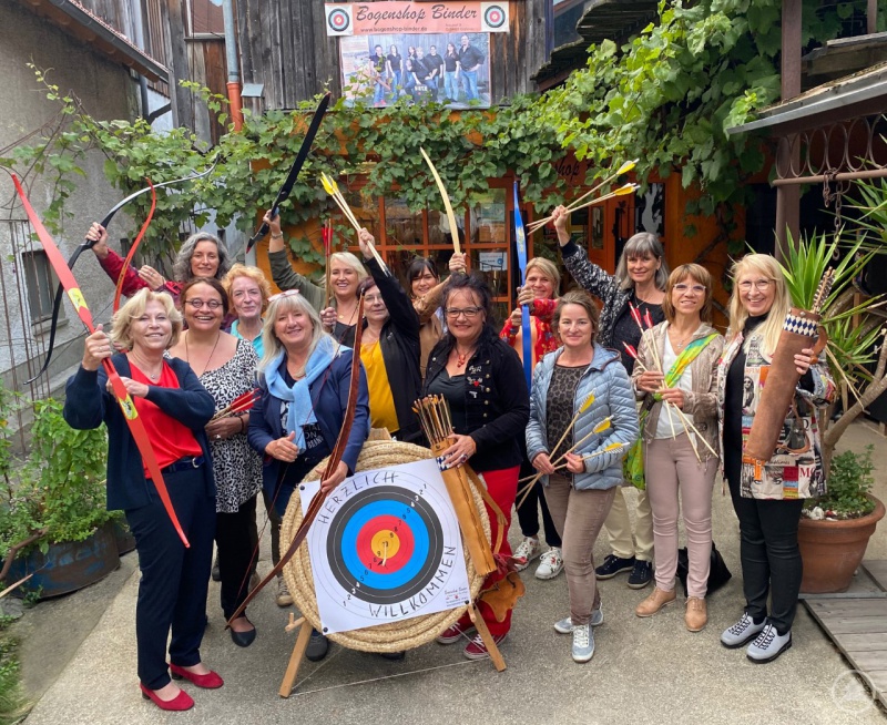 “ Nach dem Blick hinter die erfolgreichen Firmenkulisse konnten die Unternehmerinnen ihr Talent beim Bogenschießen ausprobieren. In der eigenen Indoorhalle durften die Mitglieder nach kurzer Einweisung selbst den Bogen spannen und den Pfeil in eine zirka zehn Meter entfernte Zielscheibe platzieren. „Bogenschießen ist in jedem Alter möglich“, weiß Manuela Binder. Es sei nicht nur ein idealer Sport für die ganze Familie, für Schulklassen oder eine ideale Maßnahme zur Teambildung sondern auch eine große persönliche Erfahrung. „Die meisten Kunden haben das Problem des Loslassens“, sagt Binder und ergänzt: „Eine Erfahrung, die sich auf viele Situationen des beruflichen und geschäftlichen Lebens übertragen lässt. Beim Bogenschießen kann man die Kraft des Loslassens entdecken, die eigene Mitte oder den Weg zu mehr Aufmerksamkeit und Gelassenheit finden.
