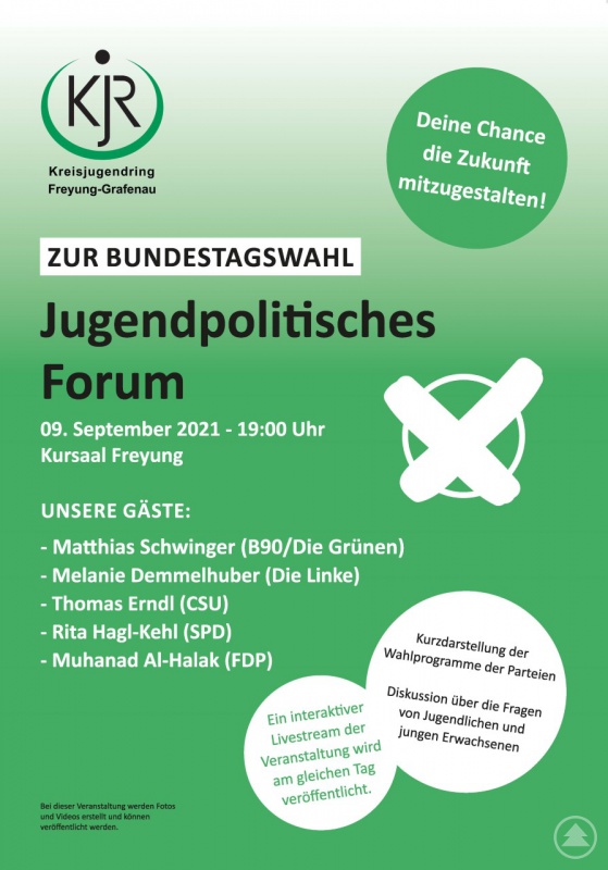 Gemeinsam mit den Direktkandidaten von SPD, CSU, FDP, B90/Die Grünen und Die Linken sollen verschiedene gesellschafts- und jugendpolitische Themen vorgestellt, erörtert und debattiert werden. Dabei stehen die Fragen und Anliegen der Jugendlichen natürlich im Vordergrund. Der Kreisjugendring ist in diesem Forum das Sprachrohr, um in einem geordneten Rahmen gehört zu werden, so dass kein Jugendlicher Sorge tragen muss, dass er oder sie im Rederecht eingeschränkt wird.