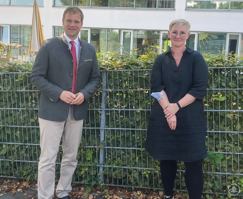 Bezirkstagspräsident Dr. Olaf Heinrich und Chefärztin der Kinder- und Jugendpsychiatrie Dr. Tanja Hochegger vor dem Bezirkskrankenhaus Passau.