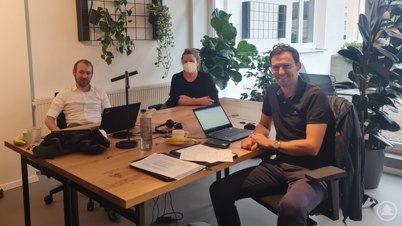 Die Gründer Johannes Fürst (links) und Stefan Blöchl mit Stephanie Fichtl, Geschäftsführerin des GreG FRG, im CoWorking Bereich des Gründerzentrums.