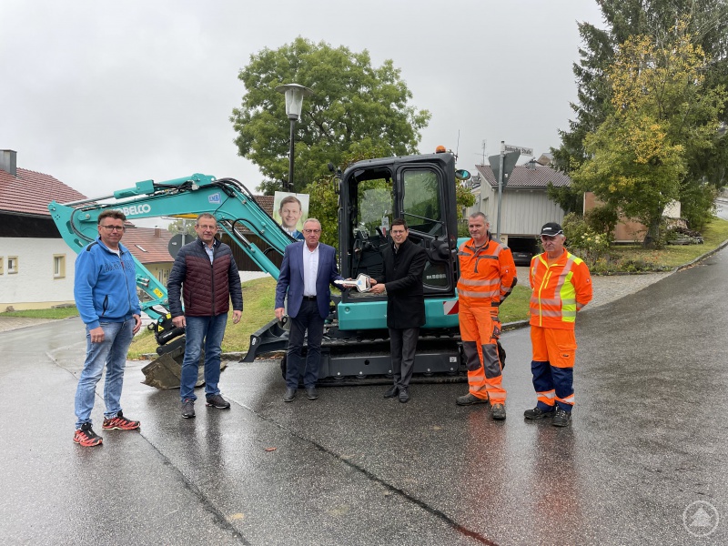 Seine Feuertaufe hat der türkise Bagger auch bereits bei einem ersten Wasserrohrbruch bestanden, sodass die offizielle Übergabe durch Herrn Sellner der Firma EMB Baumaschinen mbH nicht wie geplant auf dem Bauhofgelände, sondern am ersten Einsatzort des Baggers stattfand.