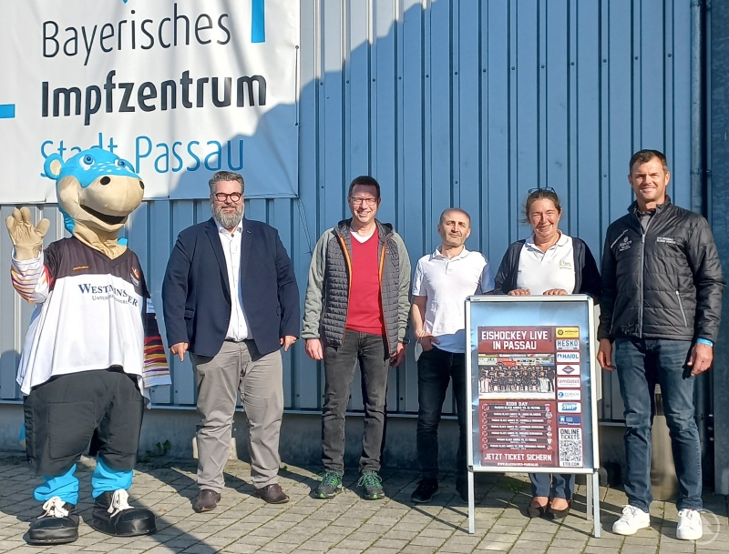 Über die Sonderimpfaktion für Eishockey-Fans freuten sich Christian Eder (von rechts), Vorsitzender der Passau Black Hawks, Andrea Klement, Standortleiterin des städtischen Impfzentrums, Impfarzt Dr. Mustafa Krayyem, Erik Linseisen, Verwaltungsleiter des städtischen Impfzentrums, Bürgermeister Andreas Rother und das Maskottchen des Kids-Clubs des Deutschen Eishockey-Bundes.