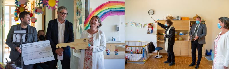 Zum Abschluss der Reden überreichte Alexander Sonnleitner (ssp Planung GmbH, Waldkirchen) Frau Wilhelm den symbolischen Schlüssel für die neue Kinderkrippe und den Kindern Lebkuchen in Schlüsselform. Am Ende des formellen Teils der Feier bekam die neue Kinderkrippe den kirchlichen Segen vom Hochwürdigen Herrn Pfarrer Hektor, der bei einem Rundgang in der Einrichtung jeden Raum mit musikalischer Begleitung der Kindergartenkinder segnete. Ehrengäste waren Konrad Niederländer (Bischöflich Beauftragter für den Caritasverband in der Diözese Passau) und die Ehrenbürger Michael Stockmeier und Johann Wegerbauer.