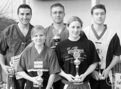 Jeweils in den Pokalrängen: vorn Theresa Schinabeck (l.) und Nicole Blab, dahinter, v. l. Robert Kn19 dlse der, Jiri Hlusek, Sebashhrend, hrend in den Damenklassen sowohl Theresa Schinabeck gegen die Nationalkaderkämpferin Natalia Hein aus Ebern wie auch Nicole Blab gegen Susanne Platen aus Seubersdorf im Halbfinale eine Niederlage akzeptieren mussten, aber in der Endabrechung zumindest den 3 Platz belegten, konnten sich die drei männlichen Bayerwaldkämpfer jeweils üüraar den Endkampf qualifizieren. Sebastian Knödlseder, der als Newcomer in der Juniorenklasse bis 74 Kilogramm an den Start ging, wartete auf seinem Weg ins Finale mit guten Leistungen auf, die er im Endkampf dann aber nicht ganz bestätigen konnte, so dass er sich letztlich mit dem 2. Platz zufriedengeben musste. Zweifelsohne aber ein Ergebnis, mit dem sowohl Kämpfer als auch Betreuer mehr als zufrieden sein konnten. Auch Jiri Hlusek, der in den letzten Wochen sehr viele zusätzliche Trainingseinheiten mit Robert Knödlseder absolvierte, zeigte sich in guter Form und wusste in seinen Kämpfen mit einem aggressiven und variablen Kampfstil zu überzeugen. Dementsprechend gestaltete sich das Finale in der Gewichtsklasse bis 79 kg gegen den starken Mohammed Ftac lange ausgeglichen. Dann aber nutzte der Bayreuther Mitte der 2. Runde leichtere Unaufmerksamkeiten des Bayerwaldkämpfers und erkämpfte sich einen Vorsprung, den der Spiegelauer nicht mehr aufholen konnte. Platz 2 am Ende also auch für Hlusek. Robert Knödlseder, der in der Gewichtsklasse bis 84 kg an den Start ging, zeigte wieder einmal Kickboxen auf höchstem Niveau. Er gewann seine Kämpfe auf Grund seiner Überlegenheit jeweils durch technischen K. o. und nahm verdient den Siegerpokal mit nach Hause. Auf den Lorbeeren ausruhen können sich die Bayerwald-Kämpfer aber nicht, denn es folgen mit den Irish Open in Dublin sowie den bayerischen Meisterschaften in München bereits die nächsten Herausforderungen. ceb