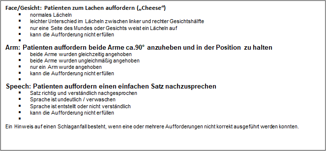 Zur raschen Erkennung eines Schlaganfalls empfiehlt die S2e-Leitlinie bei Patienten mit akut auftretenden neurologischen Symptomen eine Skala wie den sogenannten FAST-Test (Face-Arm-Speech-Time). Der FAST-Test ist sehr einfach durchzuführen. Dazu wird die zu untersuchende Person gebeten, nacheinander zu lächeln (F wie face), beide Arme gleichzeitig zu heben (A wie arms) und einen einfachen Satz nachzusprechen (S wie speech). Hat die getestete Person dabei Schwierigkeiten, liegt ein Schlaganfall durchaus im Bereich des Möglichen und es sollte sofort (T wie time) der Notarzt bzw. Rettungsdienst unter Tel.: 112 alarmiert werden, so dass der Betroffene so rasch wie möglich in die nächste spezialisierte Klinik mit einer Schlaganfall-Einheit (Stroke-Unit) eingeliefert wird.