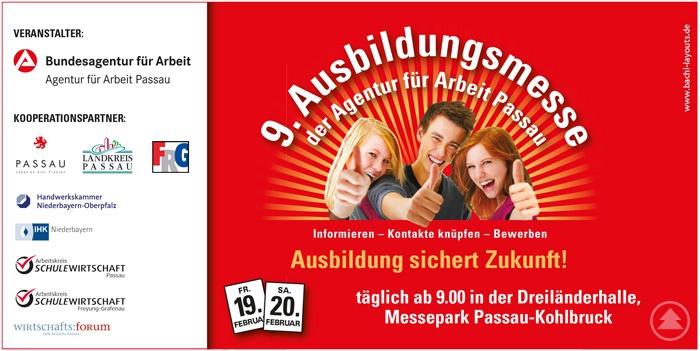 Die Ausbildungsmesse wird veranstaltet von der Agentur für Arbeit Passau zusammen mit den Kooperationspartnern Stadt und Landkreis Passau, Landkreis Freyung-Grafenau, Handwerkskammer Niederbayern-Oberpfalz, IHK Nieder-bayern, Arbeitskreis Schulewirtschaft Passau und Freyung-Grafenau sowie dem Wirtschaftsforum Passau.