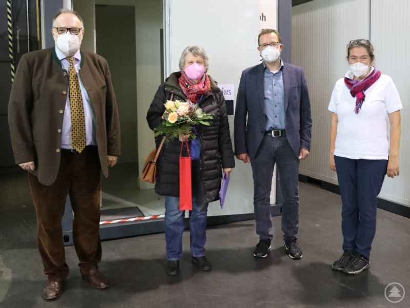Oberbürgermeister Jürgen Dupper (links), Andrea Klement (Standortleiterin IMS Rettungsdienst GmbH, von rechts) und Erik Linseisen (Verwaltungsleiter Impfzentrum Stadt Passau) gratulieren Brigitte Schmidhuber zur 100.000. Impfung.