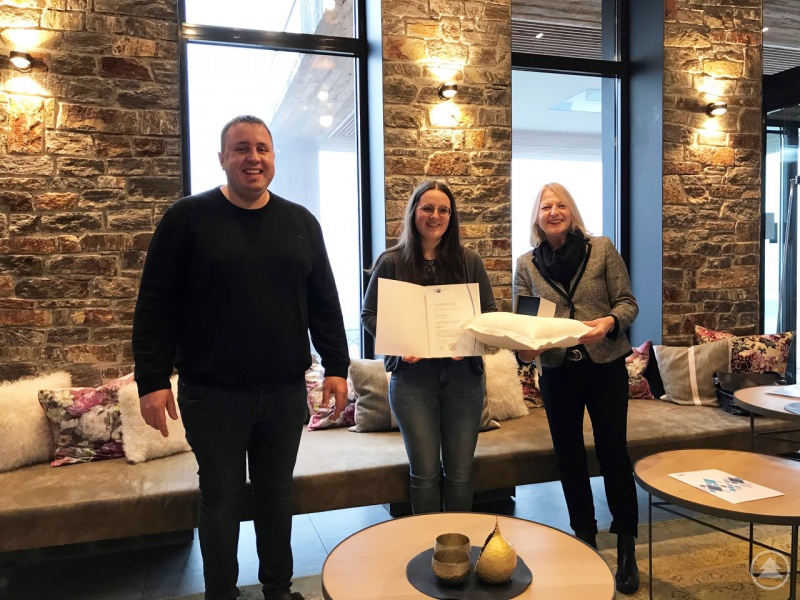 Johanna Gibis (Mitte) schloss ihre Ausbildung mit der Gesamtnote „sehr gut“ ab. Zu dieser großartigen Leistung gratulierten ihr Helmut Paster, Inhaber des Hotels Hüttenhof, und IHK-Vizepräsidentin Elisabeth Hintermann.