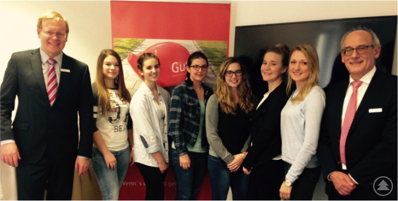 Eine gute Geschäftsidee ist jedoch nur die halbe Miete. Auch die Finanzplanung muss Erfolg versprechen. Im weiteren Gespräch machte Dr. Mikko Klein die Schülerinnen auf die Stärken und Schwächen ihrer Absatz- und Ertragsvorschau aufmerksam. Wie viele reale Unternehmensgründer auch, rechnet die Brezelstube mit einem Liquiditätsengpass im ersten Geschäftsjahr. Diese Lücke wollen die Schülerinnen mit einem Kredit der Sparkasse schließen. Dass sich eine Bank bei der Gewährung eines Kredits sicher sein muss, die Forderung auch wieder zurück zu erhalten, erklärte Herr Dr. Klein sehr anschaulich. Zunächst wird die persönliche Kreditwürdigkeit der Unternehmer unter die Lupe genommen. Verläuft diese Prüfung positiv, werden das Geschäftskonzept und die Finanzplanung beleuchtet und auf Rentabilität geprüft. Zuletzt erhielten die Mädchen noch wertvolle Tipps zum Thema private und betriebliche Risikoabsicherung, damit sowohl die Existenzgründerinnen als auch der Geschäftsbetrieb für den Schadensfall abgesichert sind.