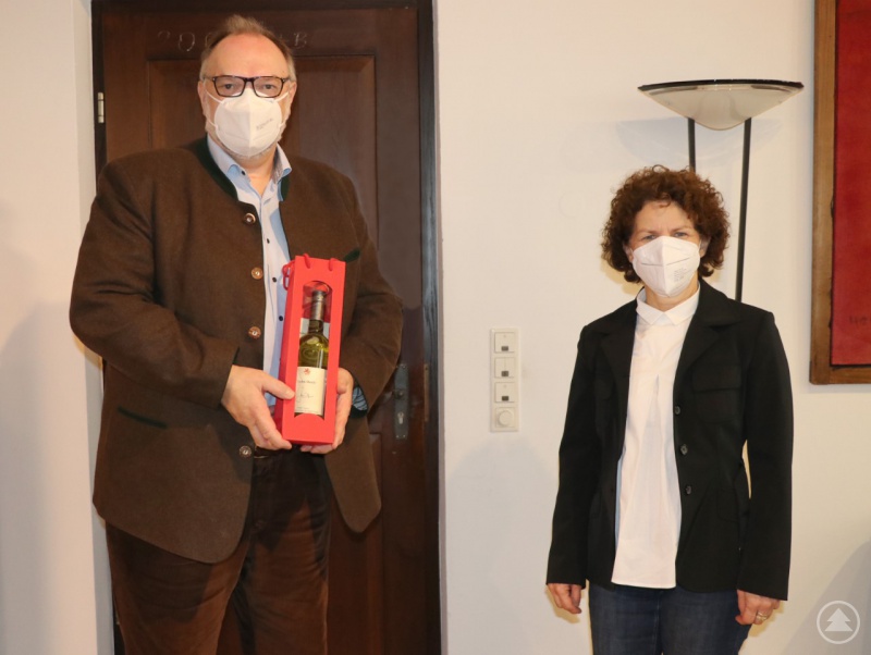 Oberbürgermeister Jürgen Dupper freut sich mit Bettina Mack vom Verein LichtBlick Seniorenhilfe, dass auch in diesem Jahr zur Weihnachtszeit bedürftige Seniorinnen und Senioren im Stadtgebiet mit einer Zuwendung bedacht werden können. Als kleines Dankeschön überreicht er eine Flasche Stiftswein.
