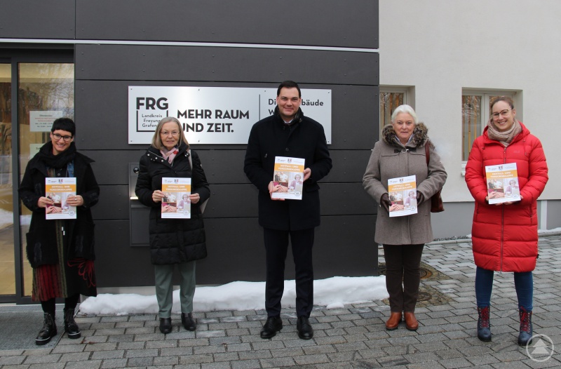 Seniorenbeauftragte Anna Mitterdorfer (2. v. re.) und Behindertenbeauftragte Anita Moos (2. v. li.) freuen sich gemeinsam mit Landrat Sebastian Gruber und den beiden Projektbeauftragten des Landratsamtes Freyung-Grafenau Christian Fiebig (nicht auf dem Bild) und Andrea Hohenwarter (li.) sowie Laura Poost (re.) vom Büro für Senioren und Menschen mit Handicap im Landratsamt über die gelungene 3. Auflage der Notfall- und Vorsorgemappe des Landkreises Freyung-Grafenau.