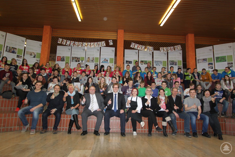 Daumen nach oben für die Ausbildungsmöglichkeiten im Arberland: Rolf Jungmann (vorne, v.l.) von der Schreinerei Jungmann, Konrektor Markus Lemberger, Schulleiterin Irene Luber, Richard Kauer vom Edeka-Markt Kauer, Regionalmanager Stephan Lang von der ARBERLAND REGio GmbH, Laura Kroiss, Isabella Pöschl und Stefanie Hübner vom Hotel "Zum Kramerwirt", Gerhard Aichinger und Azubi Christoph von der Linhardt GmbH & Co.KG sowie Marlene Kandler von der ARBERLAND REGio GmbH freuten sich beim Aktionstag "Karriere Schritt für Schritt" über das große Interesse der Mittelschüler in Teisnach.