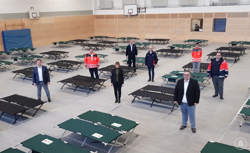 Zweiter Bürgermeister Andreas Rother (vordere Reihe von rechts), Ordnungsreferentin Karin Schmeller, Dritter Bürgermeister Armin Dickl freuten sich zusammen mit den Beteiligten der Hilfsorganisationen Michael Walch Malteser Hilfsdienst (hintere Reihe von rechts), Alexander Aigner BRK, Werner Kloiber Malteser Hilfsdienst, Florian Emmer FFW Passau und Klaus Achatz BRK über die eingerichtete Dreifachhalle.