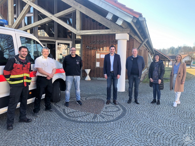 Im Gespräch zwischen dem örtlichen Einsatzleiter Markus Maier (links) vom BRK und Landrat Sebastian Gruber (Mitte) in Röhrnbach ging es um die umfangreichen Vorbereitungen für die Aufnahme einer größeren Zuteilung an ukrainischen Flüchtlingen von staatlicher Seite im Landkreis, mit vor Ort waren (von links) Markus Drasch Bavaria Sicherheitsdienst, Gunther Endres von der Führungsgruppe Katastrophenschutz, der stellvertretende Röhrnbacher Bürgermeister Mario Dumps, Jitka Rebendova, ehrenamtliche Übersetzerin sowie die zuständige Abteilungsleiterin Barbara Schober.