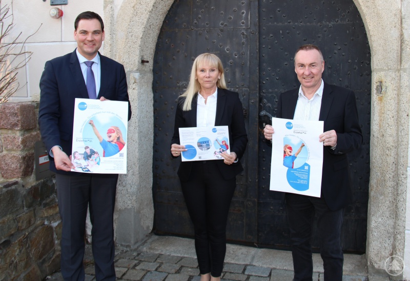 Im September nimmt die Staatliche Fachakademie für Sozialpädagogik in Schlag ihren Betrieb auf. Landrat Sebastian Gruber, Schulleiterin Elvira Wudy-Engleder sowie Außenstellenleiter Robert Eberle (von links) präsentieren Flyer und Plakate mit denen man um angehende Erzieherinnen und Erzieher wirbt, die in Grafenau ihre Ausbildung absolvieren wollen.