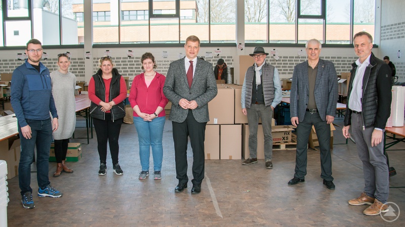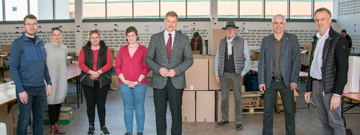 Bezirkstagspräsident Dr. Olaf Heinrich mit den ehrenamtlichen Helferinnen und Helfern in der Halle der Landmaschinenschule, die zum Spendensammellager umfunktioniert wurde; im Bild v. l.: Bezirksrat Michael Deller, Alica Klemm, Melanie Gnauer, Stefanie Forcher, Bezirkstagspräsident Dr. Olaf Heinrich, Christian Beckmann, Leiter der Landmaschinenschule, Ljubomyr Sawjuk und Bernd Einmeier