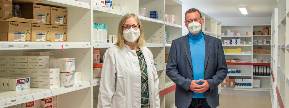 Krankenhausdirektor Uwe Böttcher und die neue Chefapothekerin Dorit Engelke in den Räumlichkeiten der Klinikapotheke des Bezirksklinikums Mainkofen.