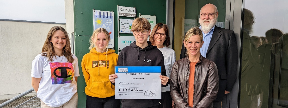 An allen niederbayerischen Realschulen wurde eine große Hilfsaktion für Kinder in der Ukraine gestartet. An der Realschule Grafenau entschied man sich für eine Aktion, die in Bezug zur Fastenzeit steht, sind doch „Fasten“ und „Almosen geben“ zwei Grundpfeiler der österlichen Bußzeit. Die Idee: eine Woche lang das gewohnte Limo einmal ersetzen durch das an der Schule kostenlose Waldwasser oder z. B. auf teure Snacks in der Schule und auch zuhause verzichten und auf einfachere und günstigere Lebensmittel zurückgreifen. Es geht um bewussten Verzicht, um das Aufbrechen und Überdenken von Gewohnheiten. Das auf diese Weise in dieser Woche gesparte Geld sollte gespendet werden. Es beteiligten sich Schüler und Lehrer gleichermaßen an dieser Aktion und tatsächlich kam ein schöner Betrag zusammen: 2466 € können an das „Aktionsbündnis Katastrophenhilfe“ übergeben werden. Herzlichen Dank an alle Spender.