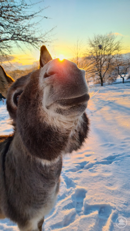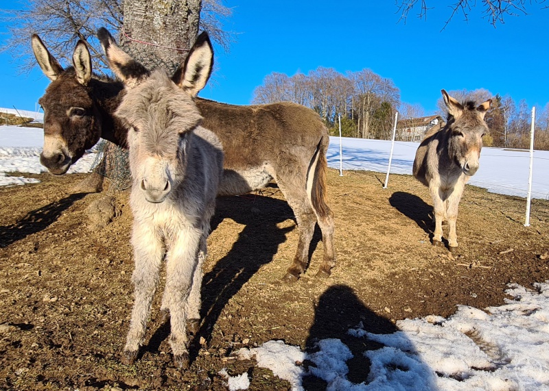 Ein Esel braucht sehr lang, bis er Vertrauen zu einem gefasst hat. Man sagt, erst nach einem Jahr sind sie im neuen Zuhause angekommen. Wenn er das dann aber einmal hat, folgt er dir überall hin.