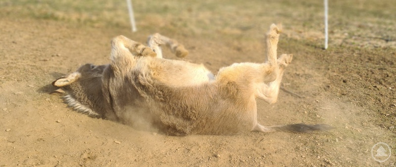 Ebenfalls „staubt“ ein Esel immer. Man sagt, wenn er keinen Staub am Fell hat, ist es kein gesunder Esel. Sie nehmen liebend gerne ein Staubbad. Und wenn man sie striegelt, gehen sie danach gleich wieder zum Sandbaden.