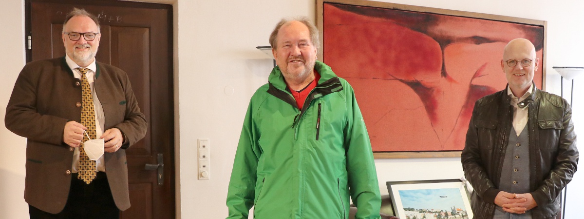 Oberbürgermeister Jürgen Dupper (von links) dankte Alois Zechmann im Beisein von Wolfgang Seiderer (rechts), Referent für Bau und Umwelt, für seine langjährige Tätigkeit in der Naturschutzwacht mit einer Flasche Stiftswein.