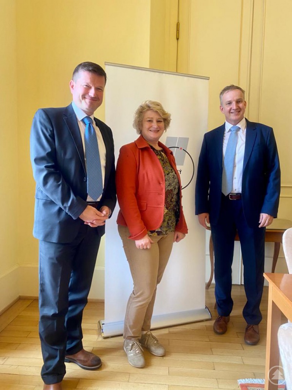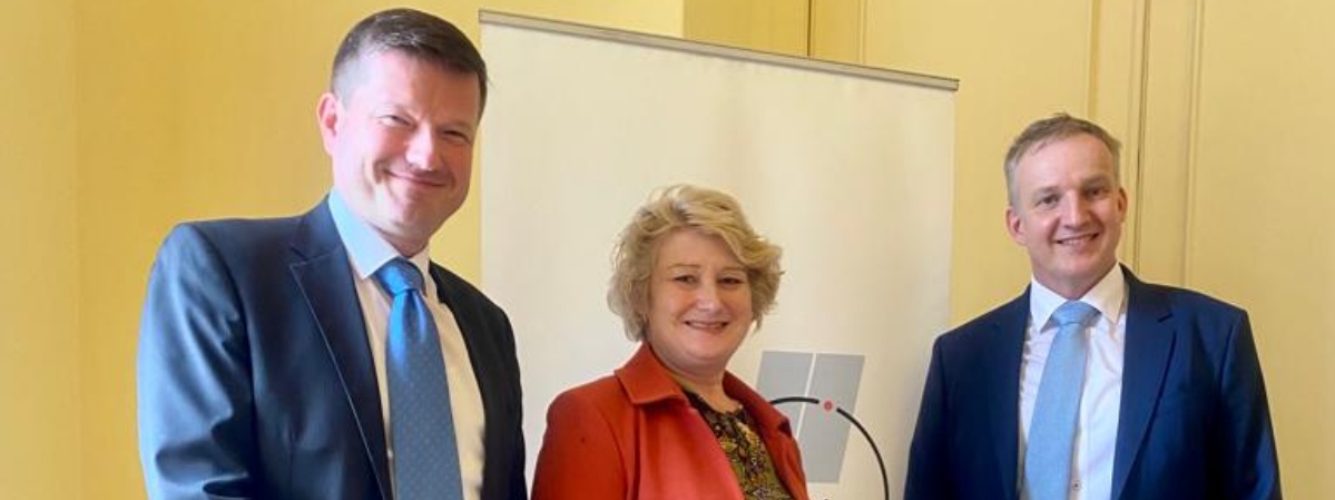 Martin Kastler, Leiter des Vorstandsbüros und Planungsstabs bei der Hanns-Seidel-Stiftung München, Bundesvorsitzender der Ackermann-Gemeinde, Mitglied des Europäischen Parlaments a.D. (links), und Jindich Fry, Staatssekretär Ministerium für Schulwesen, Jugend und Sport der Tschechischen Republik - vorheriger Vorsitzender des Verwaltungsrates (rechts), gratulieren Rita Hagl-Kehl zur Wahl als neue Vorsitzende des Verwaltungsrates des Deutsch-Tschechischen Zukunftsfonds.