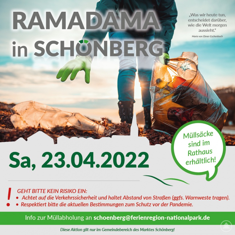 Um uns allen und unseren Gästen ein gepflegtes und sauberes Schönberg bieten zu können, lädt der Markt Schönberg am 23. April 2022 zum „Rama-Dama-Aktionstag“ ein.