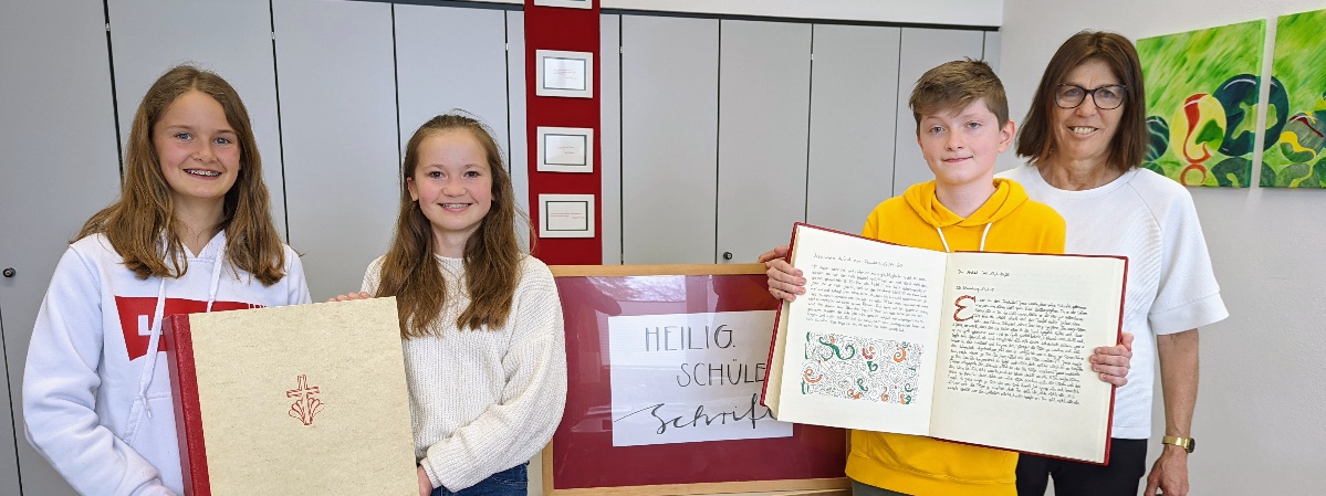 Gut zwei Jahre ist es her, als die Realschule Grafenau zusagte an dem Projekt HEILIG.SCHÜLER.SCHRIFT mitzuarbeiten. Zehn Schülerinnen und Schüler der Realschule konnten für dieses Projekt gewonnen werden und gingen mit Begeisterung und großer Sorgfalt ans Werk. Die Aufgabe bestand darin, einen festgelegten Abschnitt eines Evangelientextes von Hand zu schreiben und zu illustrieren. Dieser Beitrag floss in eine von Schülern aller Schularten der Passauer Diözese gestaltete Gesamtschrift der vier Evangelien ein. Zur feierlichen Segnung der gebundenen Bibelschrift durch Bischof Stefan Oster waren alle an dem Projekt Beteiligten ursprünglich für Sommer 2020 nach Passau eingeladen. Corona verhinderte es. Und jetzt wandert dieses Unikat zu allen beteiligten Schulen. Entstanden ist ein einzigartiges Werk, ein Prachtstück. Wer es durchblättert, ist in der Seele berührt: diese so sorgfältig beschriebenen Seiten, diese beeindruckenden Zeichnungen von kindlich-anrührend bis künstlerisch-hochwertig, diese bestechende Linie der Einheitlichkeit in einer Vielfalt der Gestaltung. Ein großes Kompliment dem Referat Schulpastoral unter der Federführung von Erdmute Fischer, die dieses aufwendige Projekt organisiert, begleitet und koordiniert hat. Und ein ebenso großes Kompliment den vielen Schülerinnen und Schülern für ihre große Mühe, Kreativität und Anstrengungsbereitschaft.