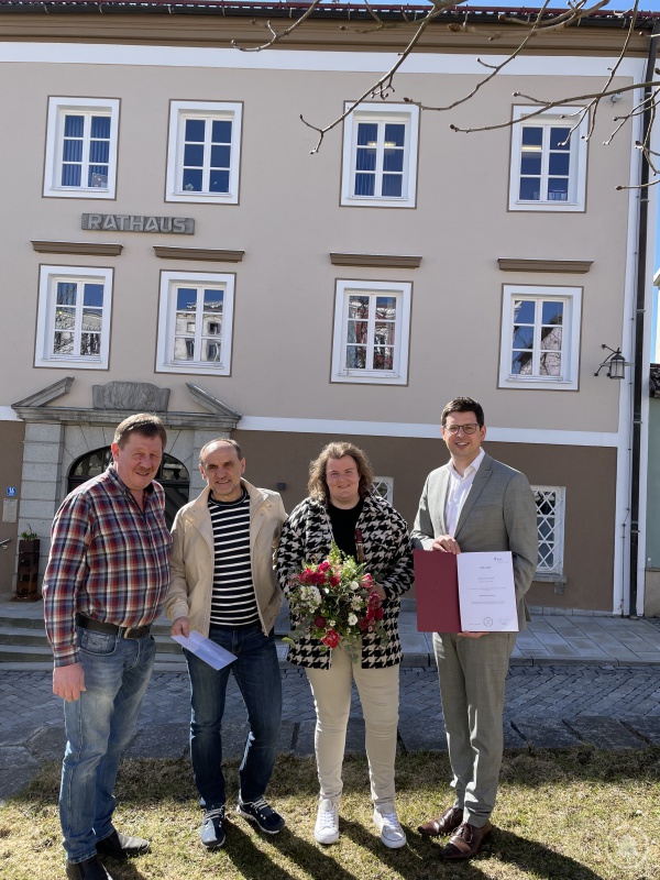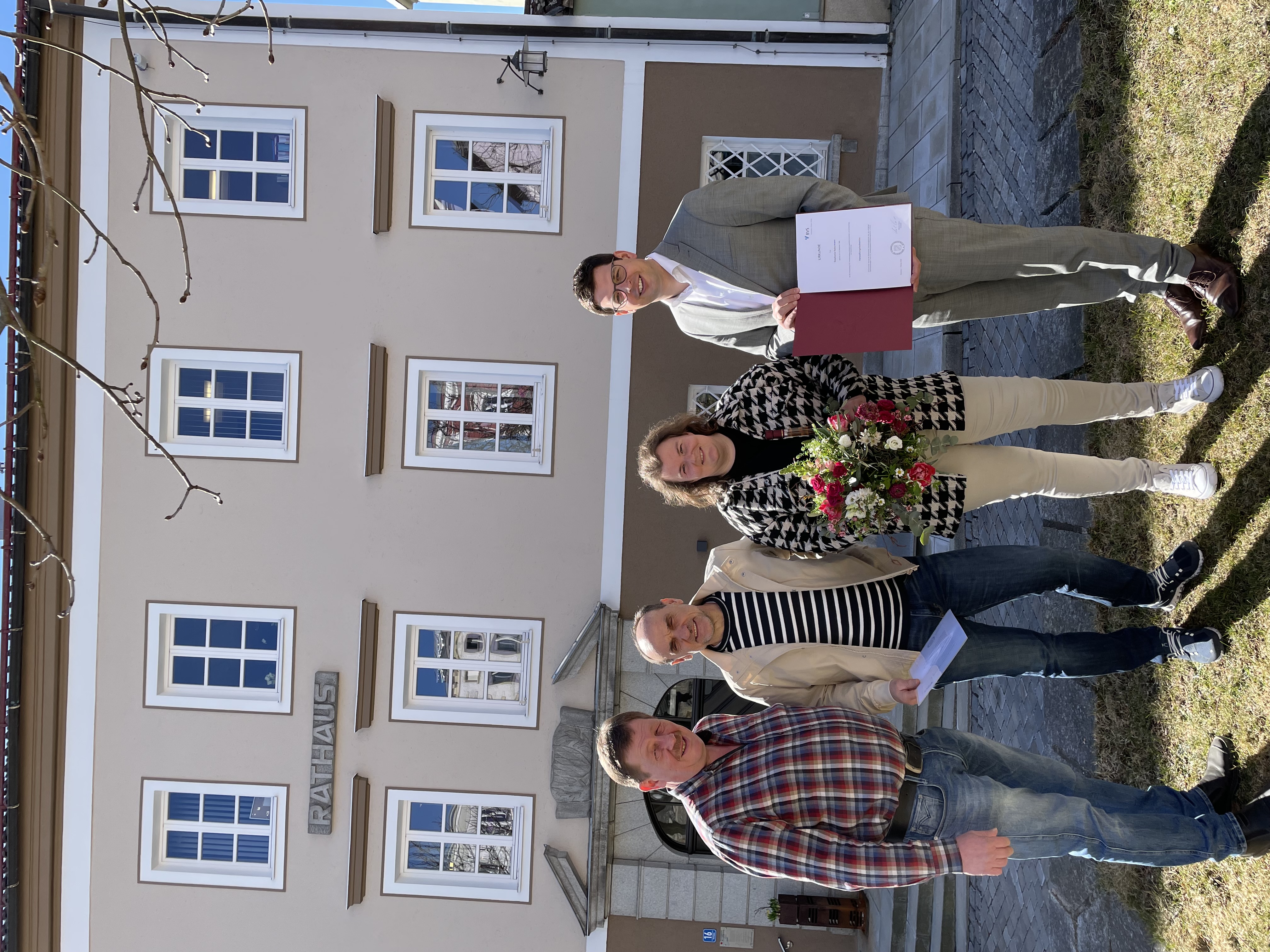 v. l. Bürgermeister Martin Geier, Adolf Hackl (Personalwesen), Absolventin Stephanie Kellermann und Bürgermeister Martin Pichler