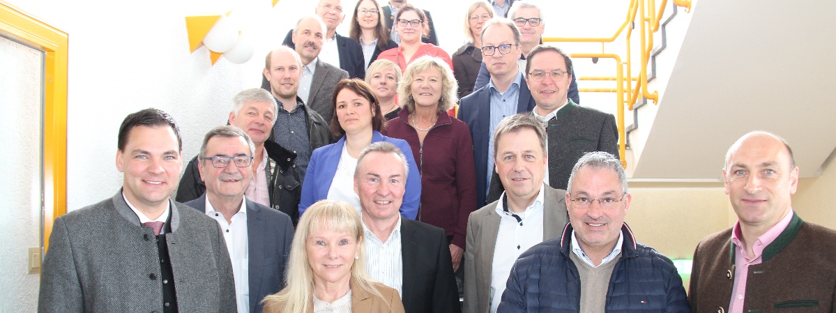Gemeinsam mit Landrat Sebastian Gruber (vorne links) und Schulleiterin Elvira Wudy-Engleder (vorne 2. von links) sowie Außenstellenleiter Robert Eberle (2. Reihe mittig) freuen sich Referentin Melanie Roider (blauer Blazer), stellv. Landrätin Hilde Greiner (direkt dahinter) und die Bürgermeisterinnen und Bürgermeister im Landkreis Freyung-Grafenau über die erste und einzige staatliche Fachakademie für Sozialpädagogik in Niederbayern.