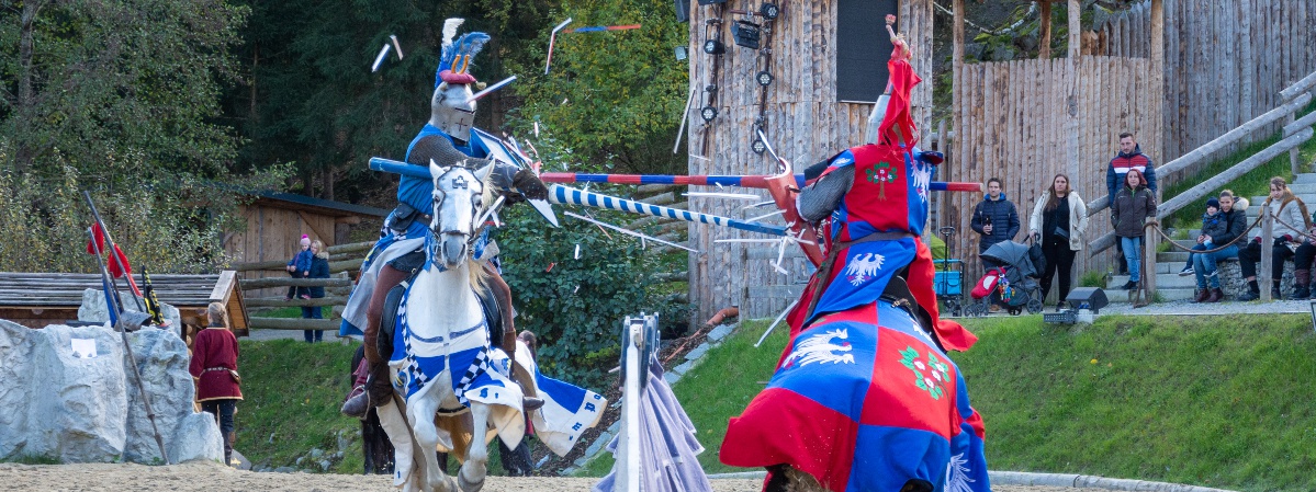 Spektakuläres Lanzenstechen präsentiert Ritter Tassilo im Kampf gegen den Schwarzen Ritter auf der Karl-May-Bühne