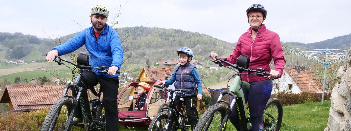 Nicole Hagenstein, Gesundheits- und Krankenpflegerin und ihr Mann Stefan, stv. IT-Leiter (beide bei der Kliniken gGmbH beschäftigt) freuen sich mit ihren Kindern Theo und Romy über die neuen eBikes.