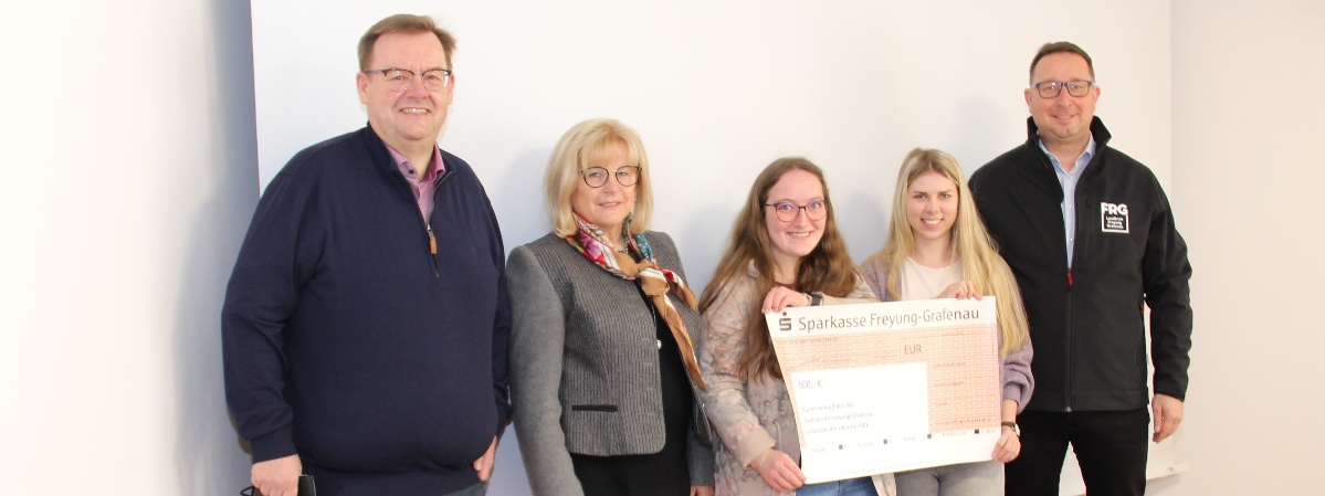 Der geschäftsführende Vorstand des Kreis-Caritasverbandes Freyung-Grafenau Josef Bauer (v.l.) freut sich zusammen mit der stellvertretenden Landrätin Helga Weinberger und den beiden Vertreterinnen der Jugend- und Auszubildendenvertretung Lena Eller und Jessica Roßgoderer sowie mit dem Personalratsvorsitzenden Alexander Bertelshofer über die Spendensumme.
