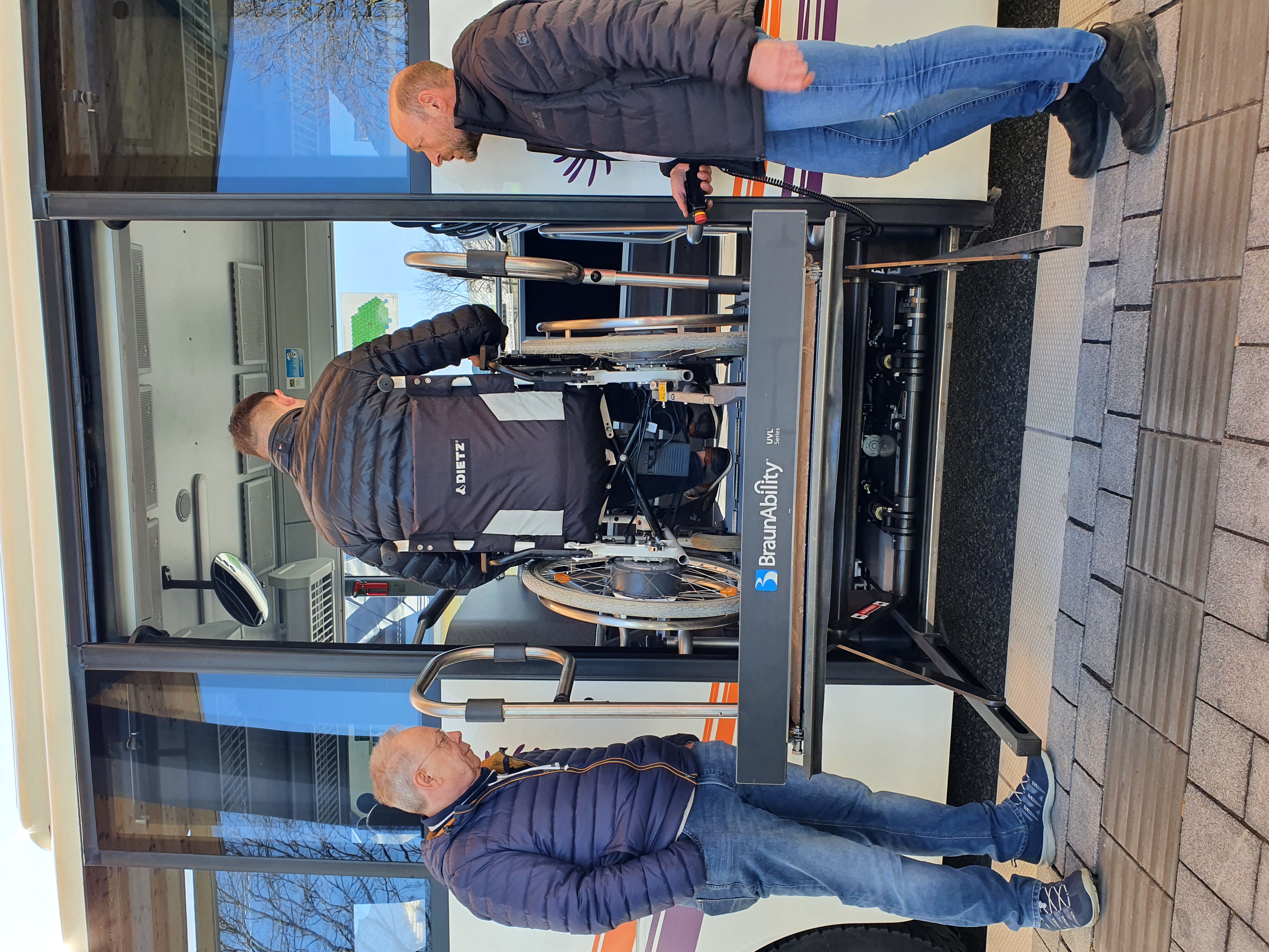 Freyung 2: Mario Brandl mit Elektrorollstuhl beim Benutzen des Hublifts