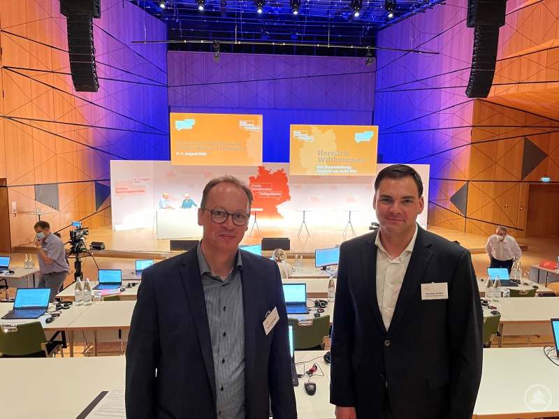 Landrat Sebastian Gruber (rechts) und der Thurmansbanger Bürgermeister und Vorsitzende der Bürgerinitiative gegen ein Endlager im Saldenburger Granit, Martin Behringer, werben für eine rege Teilnahme aus Niederbayern und hoffen dabei auf zahlreiche Unterstützung aus dem gesamten Regierungsbezirk. Das Foto zeigt Sebastian Gruber und Martin Behringer auf der dritten Fachkonferenz zur Endlagersuche im August