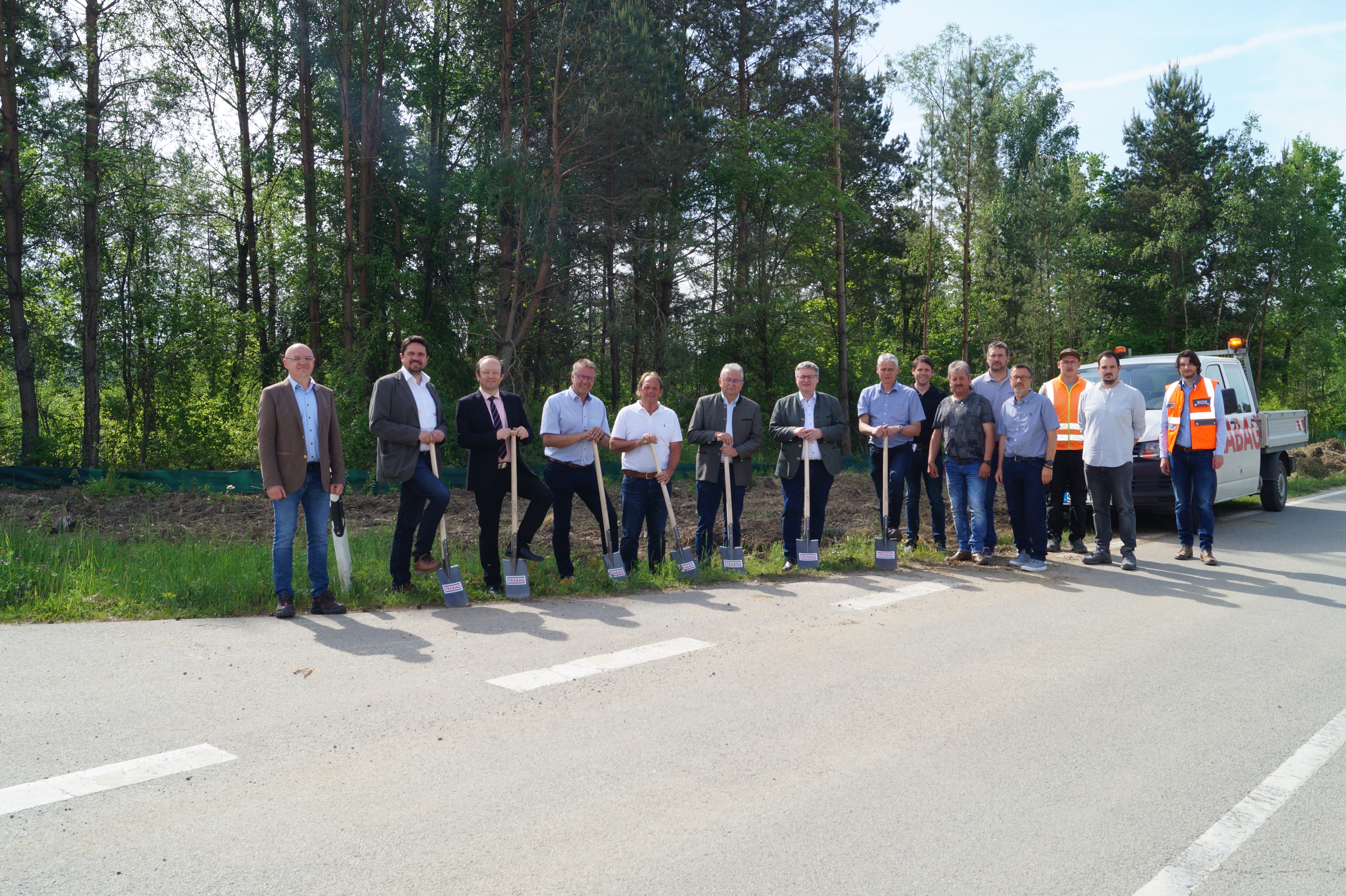 Offizieller Spatenstich an der Kreisstraße SR 22 gemeinsam mit Landrat Josef Laumer, Landtagsabgeordnetem Josef Zellmeier, den Bürgermeistern Dr. Christian Hirtreiter (Straßkirchen) und Adalbert Hösl (Aiterhofen), Mitgliedern des Bauausschusses und der Verwaltung und den beteiligten Firmen STRABAG und Ingenieurbüro KEB.