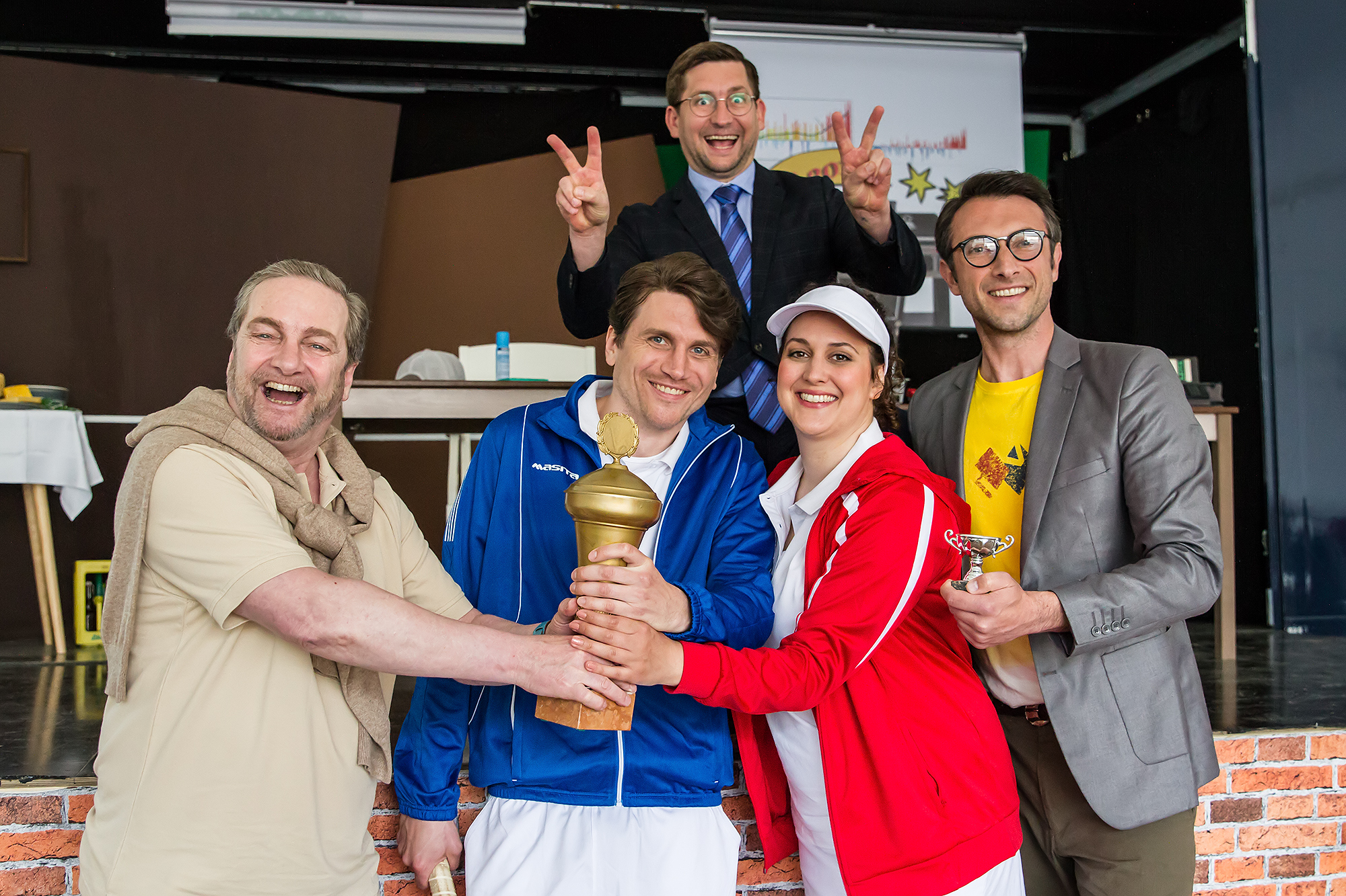 v. l.: Die Besetzung von „Extrawurst“ – Peter Kempkes als Heribert Bräsemann, Kolja Heiß als Erol Oturan, Lina Maria Spieth als Melanie Pfaff, Julius Bornmann als Torsten Pfaff, im Hintergrund Stefan Voglhuber als Matthias Scholz.