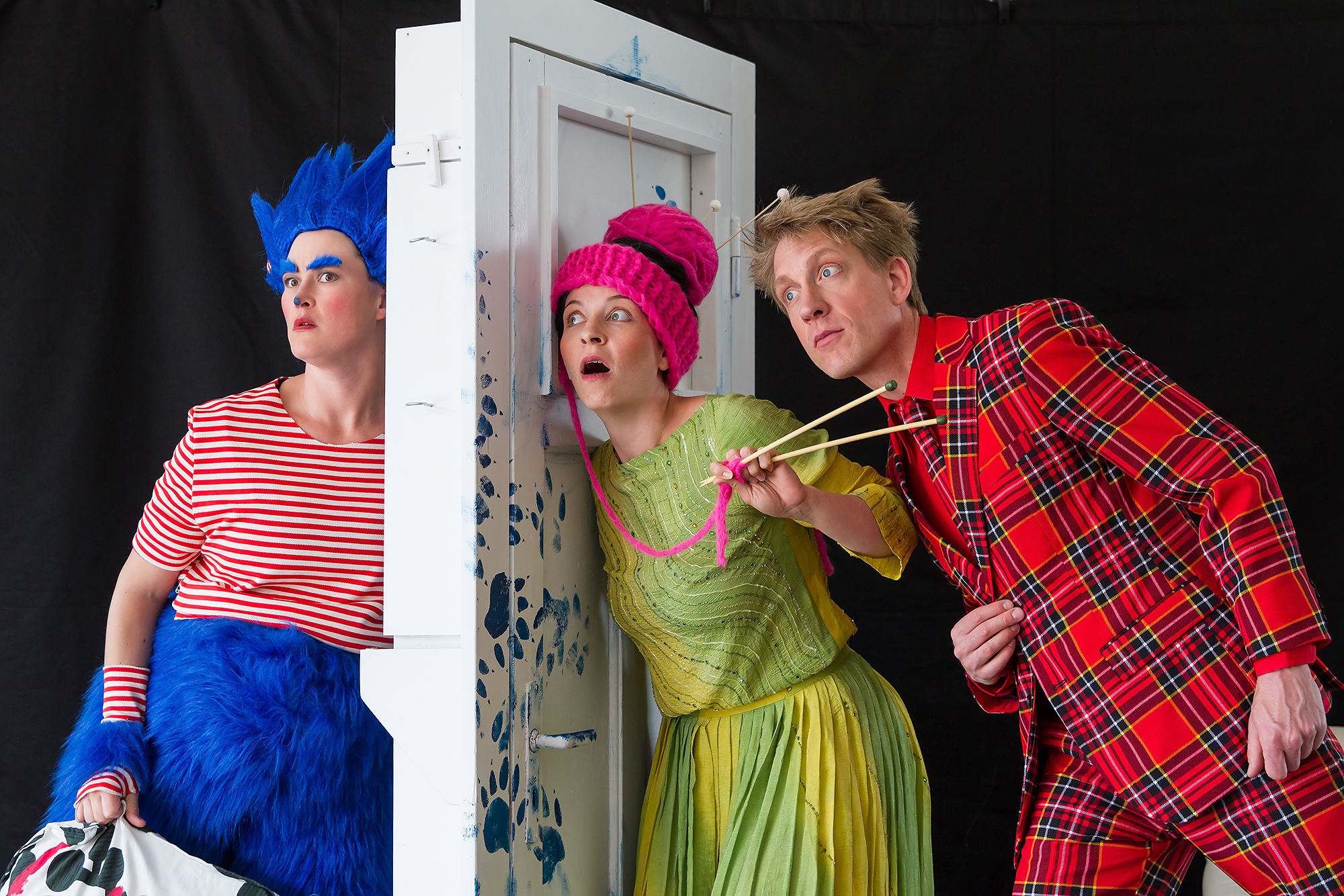 v. l.: Eva Gottschaller in der Rolle des Ungeheuers, Laura Trischkat als strickende Nachbarin und Johannes Schön als Erzähler.