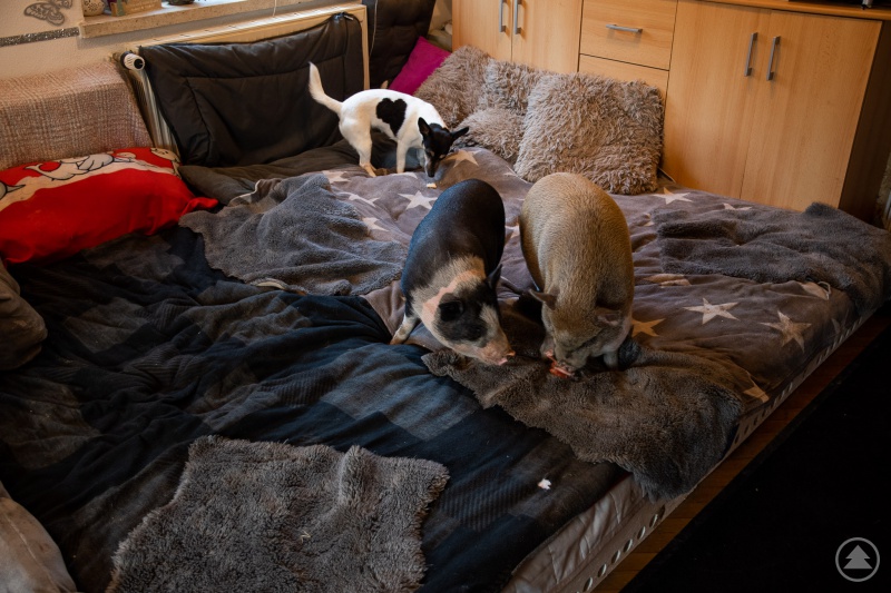 Die Tiere verbringen den ganzen Tag im Freien, nur am frühen Abend dürfen Sie in die Wohnung. Dort ist alles „schweingerecht“ eingerichtet. Nico lockt die Tiere mit ein paar Weintrauben an. Danach werden sie gebürstet und es geht auf die Liegewiese der Tiere. Diese ist für die Mädchen ca. drei auf zwei Meter groß. Die Jungs schlafen separat, jeweils in einem Hundebett. Einmal wöchentlich findet ein Beautytag statt. Hier werden die Ohren gewaschen, gebürstet und die Augen gereinigt.