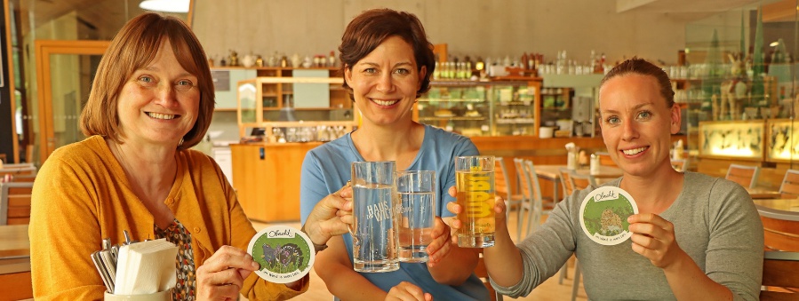 Testeten in der Gastronomie vom Haus zur Wildnis schon mal den Einsatz der neuen Obacht-Bierdeckel: Elke Ohland (von links) vom Nationalpark sowie die beiden Ideengeberinnen Katrin Roiger und Theresa Hinkofer.