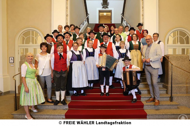 Nach einem typisch bayerischen Mittagessen in der Landtags-Gaststätte zusammen mit Manfred Eibl bedankte sich die Gruppe mit ein paar Tänzen und Musikstücken bei ihm für die Einladung. Diesen Klängen konnte auch der Fraktionsvorsitzende Florian Streibl nicht widerstehen und mischte sich unter die Zuschauer. Nach anhaltendem Applaus und einem herzlichen Dankeschön für die Einlagen, machte sich die Gruppe wieder auf den Weg.