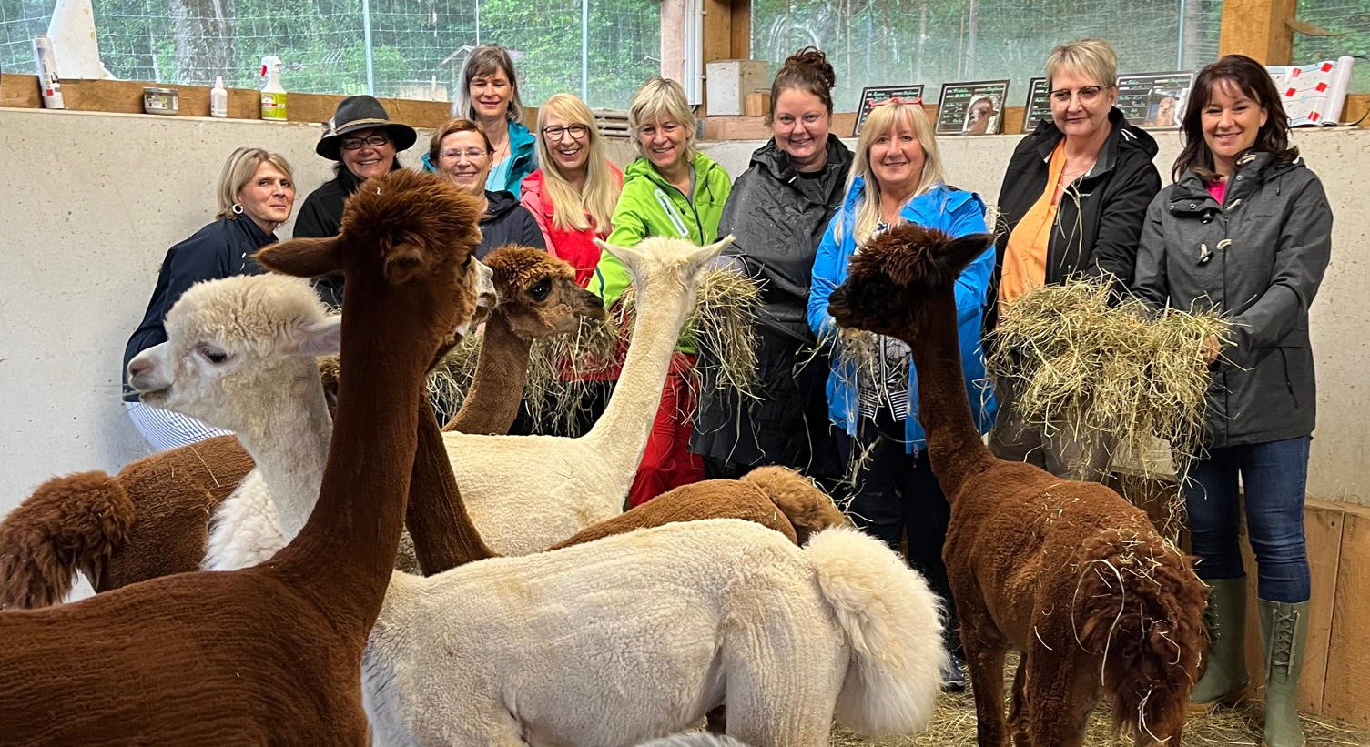 Kennenlernen im Stall: Die wild&weiblich-Unternehmerinnen mit ihrer Vorsitzenden Roswitha Prasser (3.v.r.) fütterten unter Anleitung von „Alpaka-Chefin“ Elke Haase-Sporrer (re.) die Arberland-Alpakas mit getrockneten Heubüscheln, bevor sie gemeinsam eine kleine Wanderung in den Oberfrauenauer Wald antraten.